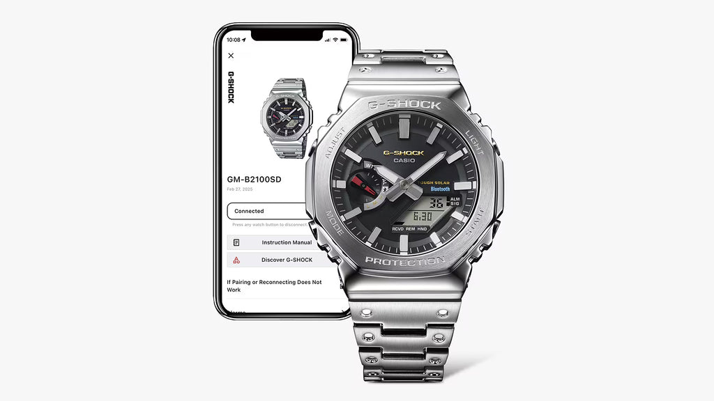 G-Shock's uses buffering components made of fine resin between the stainless-steel bezel and case and employs a three-pronged lug for the band connection to disperse shocks to the connecting pipes. The stainless-steel case also features the same screw-lock construction as the original to ensure a tight seal.