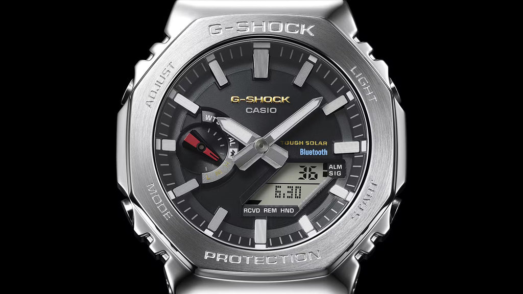 Dimpling applied to metal band pieces reproduces the look of the resin band design of the very first G-SHOCK. And the fact that the watch is crafted at Yamagata Casio, the “mother factory” where the first-ever G-SHOCK was made, brings the whole design full circle.