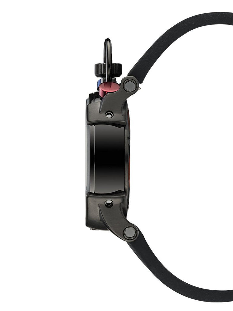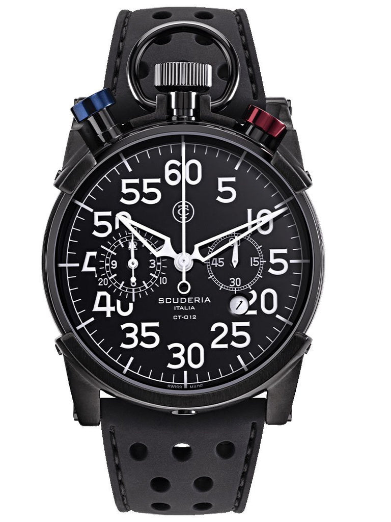 Famous Italian designer Enrico Margaritelli brings you the CT SCUDERIA line of sporty, elegant, and precision watches made of the finest raw materials and full of top-quality features and ultra-impressive details. The Corsa Classic is another racetrack inspired piece with the unmistakable appearance of a stopwatch. The second or minute numerals run uniformly around the clock, while the pushers are on top and a ring surrounds the crown. This model is all black IP stainless steel with a perforated black silicone band with rapid release mechanism for quick switching.