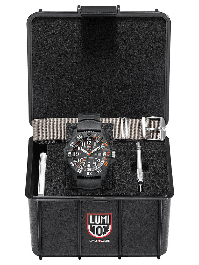 The Master Carbon SEAL collection has been a part of the Luminox line-up for more than a decade and has always delivered. This Master Carbon mens watch features a CARBONOX™+ case which weighs three times less than titanium and six times lighter than steel yet has a 316L stainless steel screw-down crown and case back. More durable, exceedingly hypoallergenic, more scratch-resistant than most other materials and more chemical and heat resistant. Comes in special packaging with an additional khaki nylon strap and a changing tool.