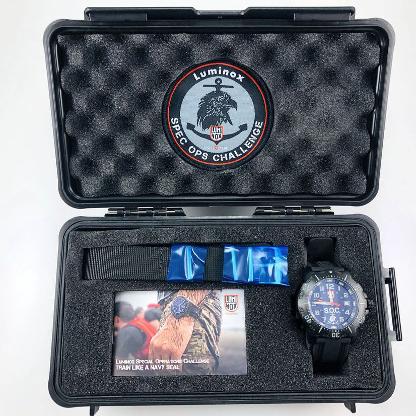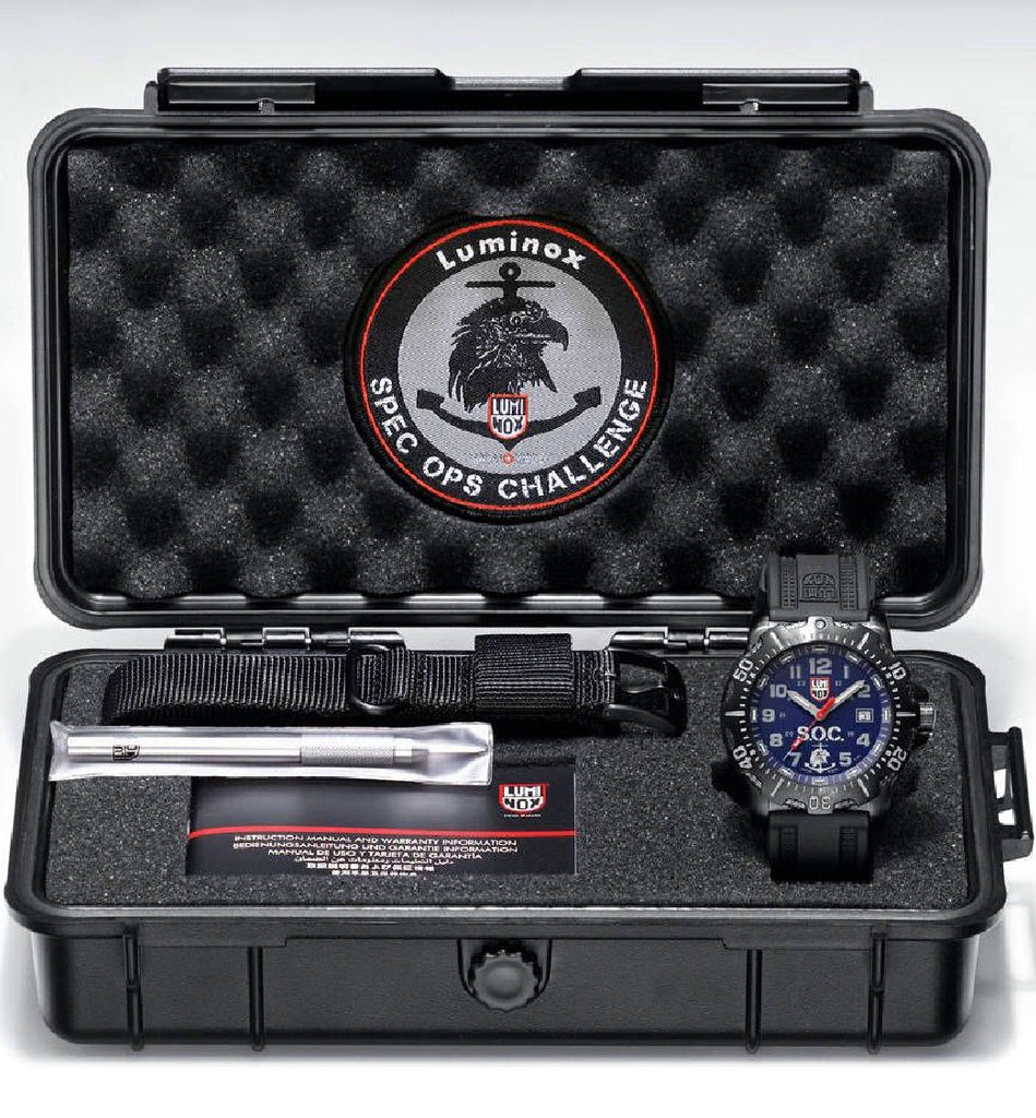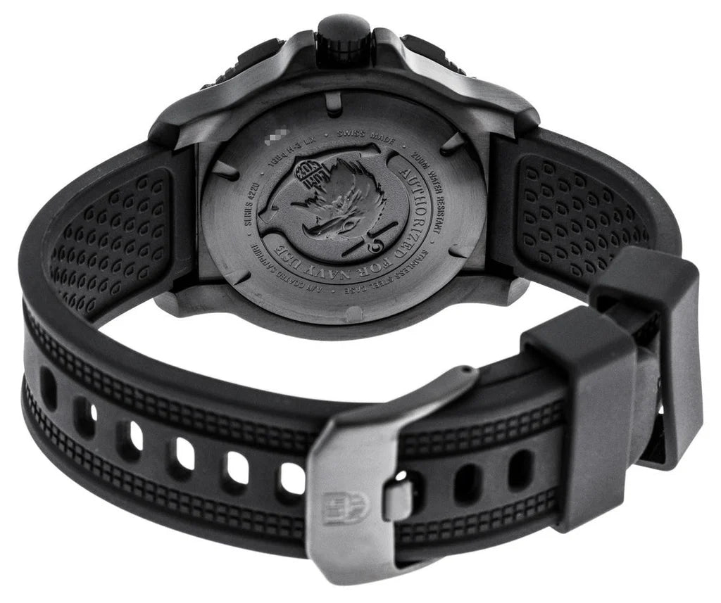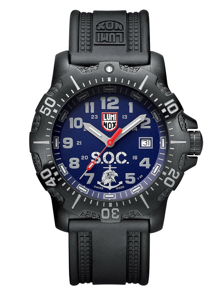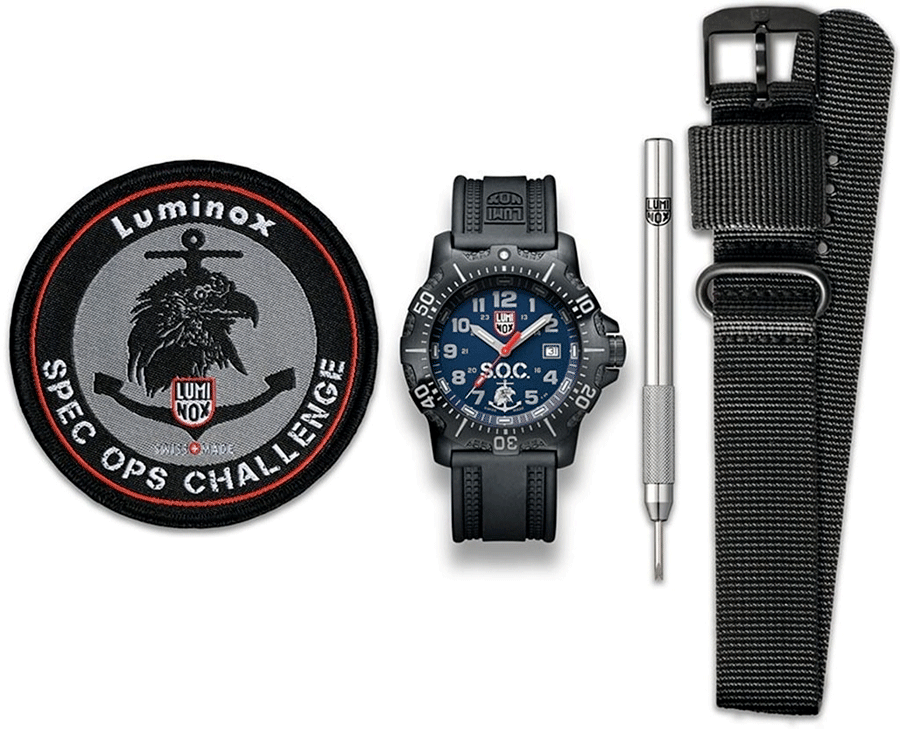 Luminox has been the watch of choice for professionals like counter-terrorism operatives, the US Coast Guard, law enforcement divers, Navy SEALs and many more for the past 25 years. In partnership with retired Navy SEALs, Luminox offers the Special Operations Challenge series - the chance for civilians to train like a SEAL for a day and commemorate Luminox's relationship with the SEALs. This Navy SEAL S.O.C. 4220 series features a 45 mm black PVD case in Luminox's Authorized for Navy Use (A.N.U.) design with a matte navy blue dial matched with gray pencil-style hands and Arabic numerals in both 12- and 24-hour formats. Tritium-based luminescent tubes called LLT's illuminate the watch thru its hands, around the sloped flange and inside the bezel pip. This is complemented by a scratch-resistant sapphire crystal, a uni-directional rotating dive bezel and a bordered date window at the 3 o'clock position adjacent to the black PVD-coated screw down crown. Touches of red and white contrast is evident via the Luminox shield, date background, Navy SEAL S.O.C. logo and seconds hand. A black polyurethane rubber strap secured by a black PVD-coated steel signed buckle completes the tough and robust look. This watch has a screw on caseback inscribed with the Navy SEAL emblem with A.N.U. badge wherein underneath lies a Ronda caliber 715 HH6, a Swiss quartz movement and is water-resistant up to 200 meters/660 feet. This packaged set also comes with a strap changing tool and a L.S.O.C. velcro patch in a presentation box.
