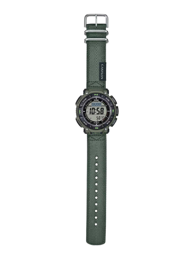 The watch features key components made with bio-based resin and a cloth band made of CASTLON®, treated with a flame retardant finish. CASTLON is a 100% plant-derived Nylon 11 fiber produced using castor oil plants. This carbon-neutral material not only helps reduce environmental impact, but is also stronger and lighter with better wear resistance, chemical resistance, and flexibility at low temperatures than the conventional Nylon 6.