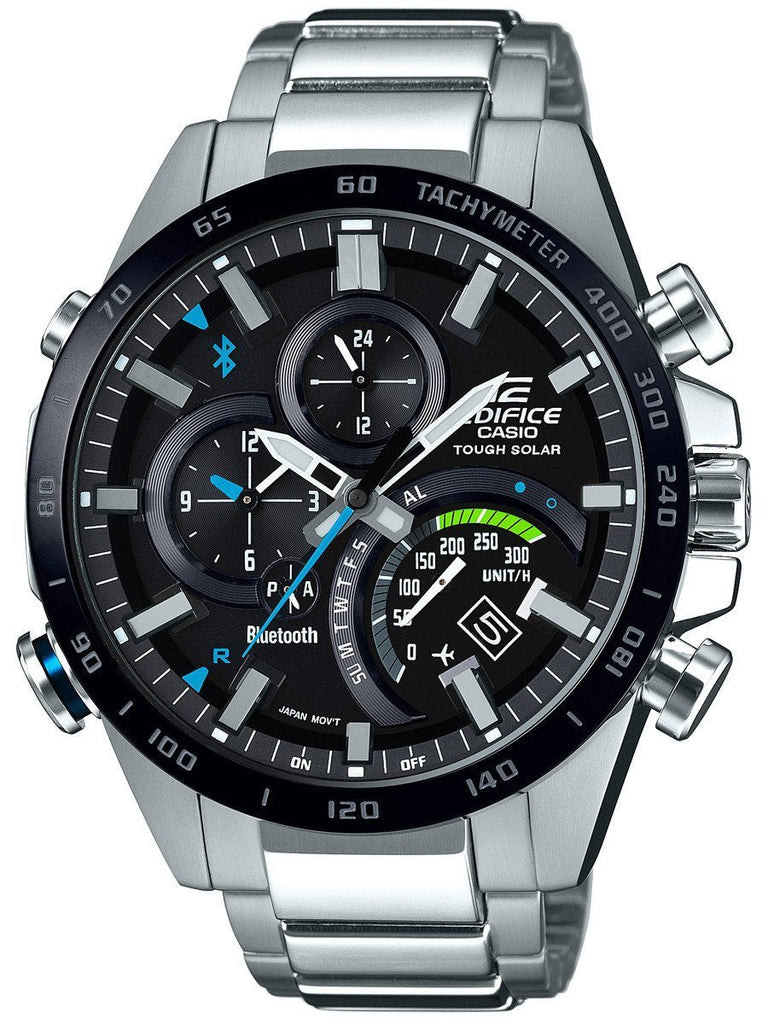 Casio's Edifice EQB501 series gets a cool new addition with this solar-powered Bluetooth smartphone mobile link watch with chronograph and Accurate Time System feature. For the first time, an Edifice watch is able to automatically retrieve world time information through a Bluetooth connection with a user's phone. Four different times a day it will access time servers located on the Internet to get an accurate reading of current home times as well as world time. The chronograph function, specifically its design, is just as cool with a color scheme that resembles a speed-indicating tachymeter.