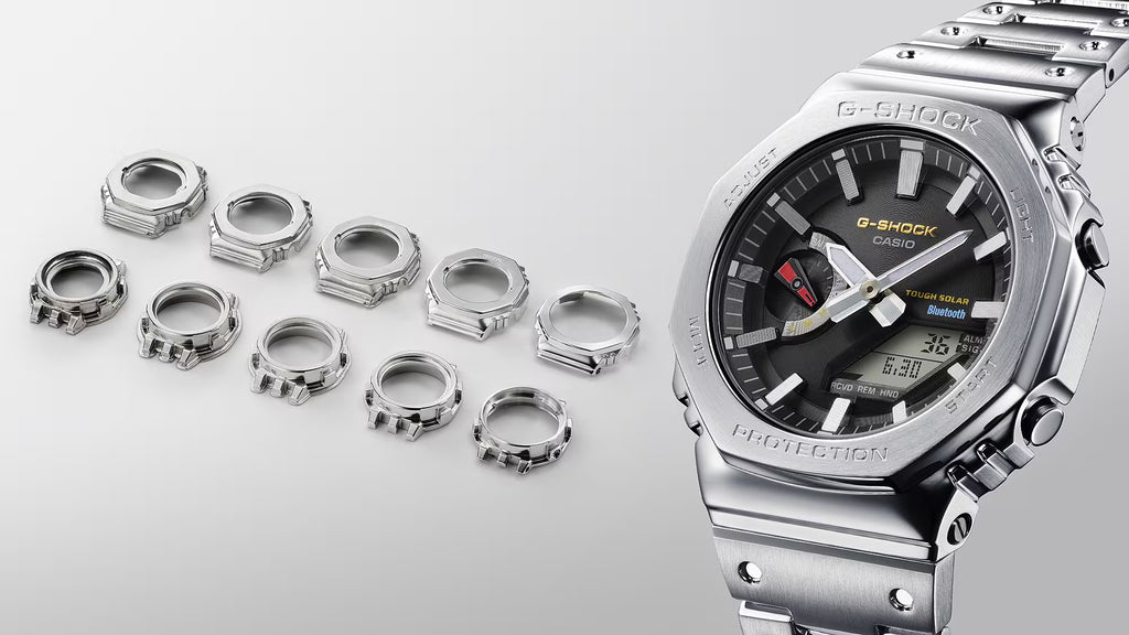 Dimpling applied to metal band pieces reproduces the look of the resin band design of the very first G-SHOCK. And the fact that the watch is crafted at Yamagata Casio, the “mother factory” where the first-ever G-SHOCK was made, brings the whole design full circle.