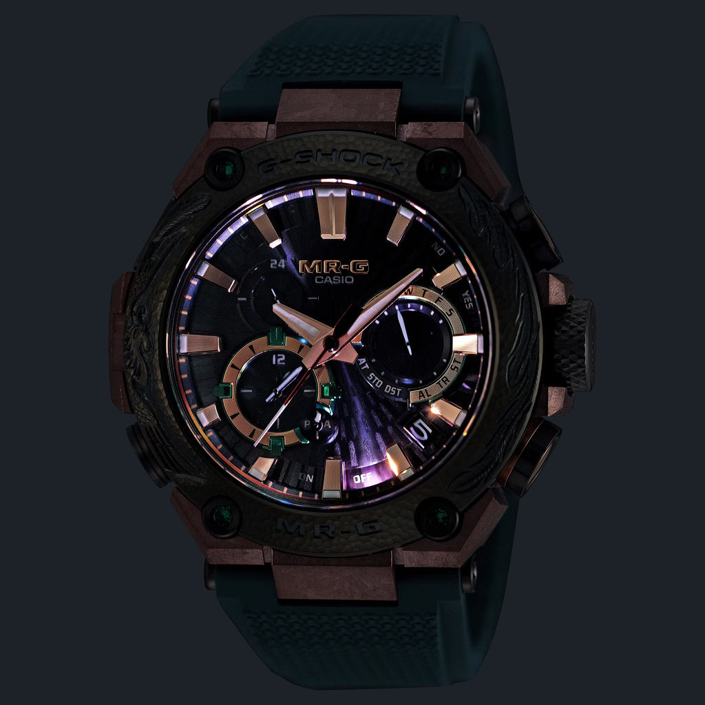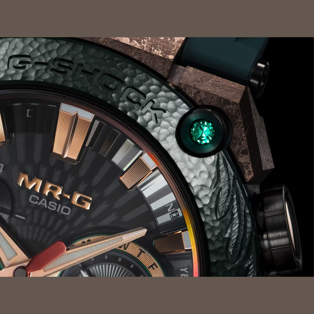 The gradated color of the dial ring captures the dynamic beauty of the phoenix’s graceful flutter. The four bezel screws set with emeralds symbolize wisdom and the power to see the truth. These dazzling elements come together to create one of the most luxurious designs in the MR-G lineup.