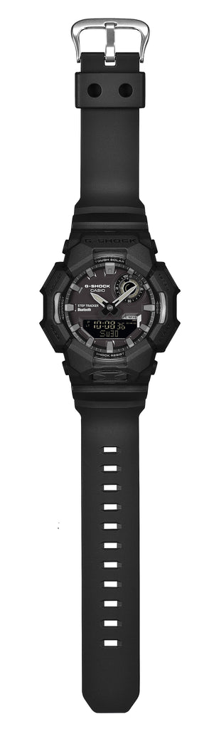 Introducing the solar-power-only watch capable of tracking and digitally displaying steps. The analog-digital combination GA-B010 features a large case with large, easy to read display. Deliciously detailed finishes — with a bezel ring treated to a vapor deposition finish, a sun-ray finish for the dial, and a metallic finish applied to the inset dial — add extra value to the toughness-oriented design. This watch requires only solar power to count steps and display tracked data on the digital display. The watch also sends data to a paired smartphone via Bluetooth®, for full functionality at your fingertips. Simply tap into the CASIO WATCHES app for automatic precision timekeeping and to easily manage life logs from your phone. The watch delivers handy features like world time and stopwatch, as well as a high-brightness LED light that can be turned on and off using the large button on front of the case. Indexes and watch hands with phosphorescent finish ensure visibility even in the dark. The watch is also made with bio-based resin, a material expected to reduce environmental impact.